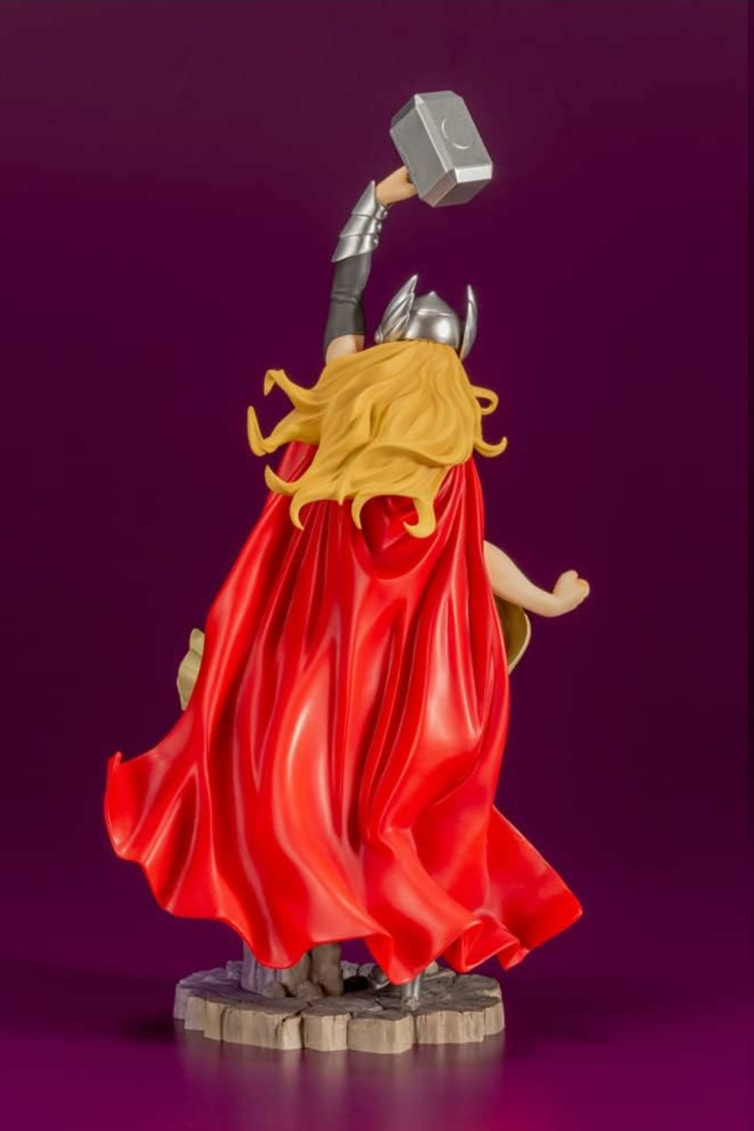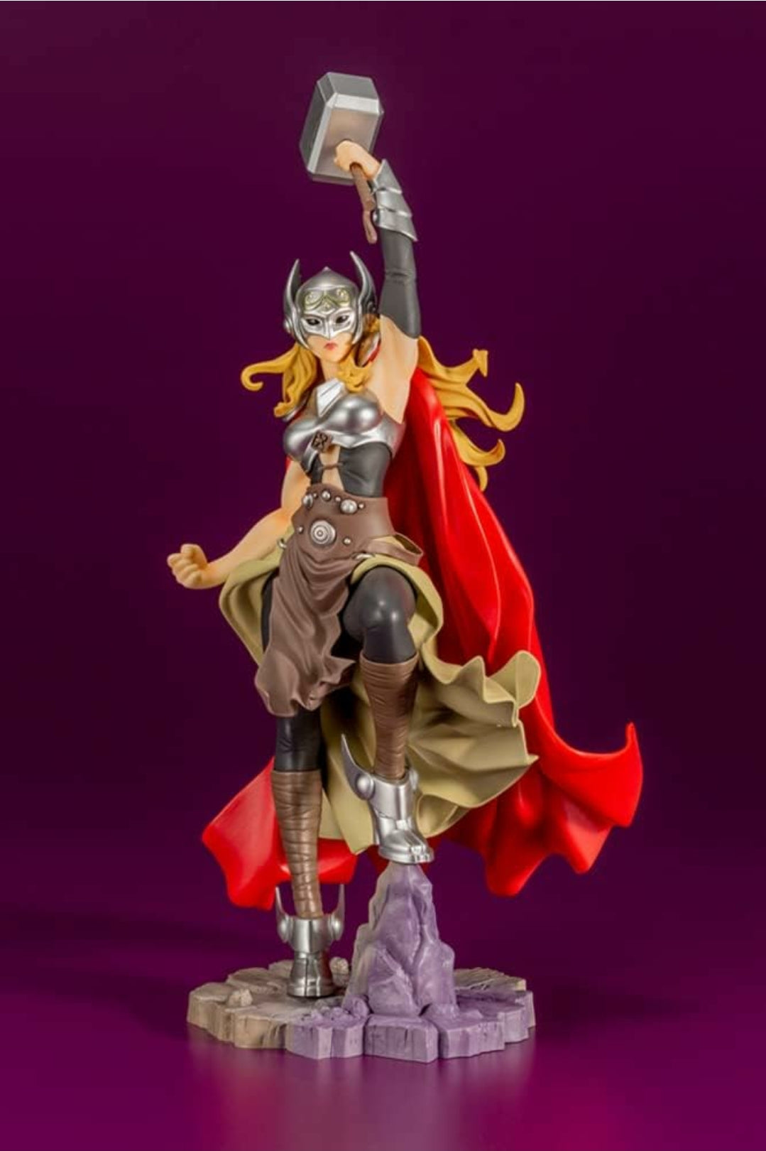 From Kotobukiya. New Production Run! The Goddess of Thunder was quick to receive a BISHOUJO statue by Shunya Yamashita in 2016. For the first time in seven years, this statue will be reproduced! Holding Mjolnir aloft, Thor stands in a pose fit for the God of Thunder. Her muscular figure strengthened by the power of Mjolnir, silver helmet and armor, and fluttering cape give the statue the elegance of a refined Asgardian. The statue can be displayed without the helmet by exchanging it with a separate head part. The base can be connected to that of the upcoming Marvel Loki Laufeyson Bishoujo Statue. The color of the base and packaging have been revised for this reproduction.